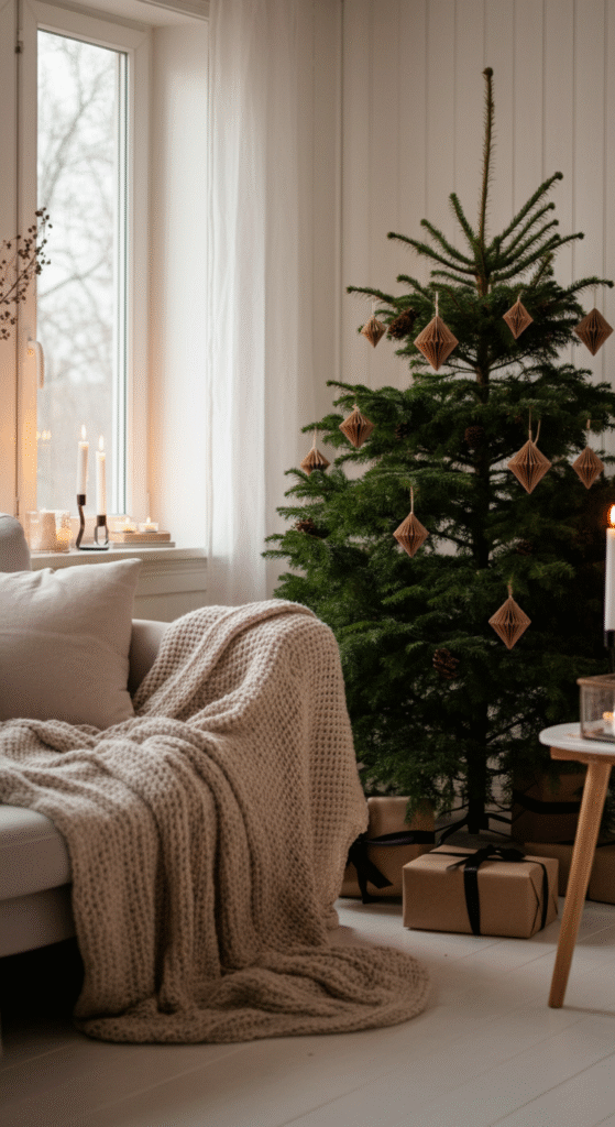 Use a white or beige base palette and accent it with organic materials like wood, linen, and wool. Add a simple evergreen wreath and a minimalist Christmas tree decorated with paper ornaments or straw stars.