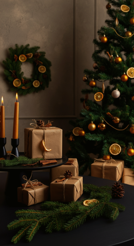 Use recycled paper ornaments, thrifted decor, or DIY natural garlands made from dried oranges, cinnamon sticks, and twine. Choose LED lights for energy efficiency and wrap gifts in reusable fabric instead of disposable wrapping paper.
