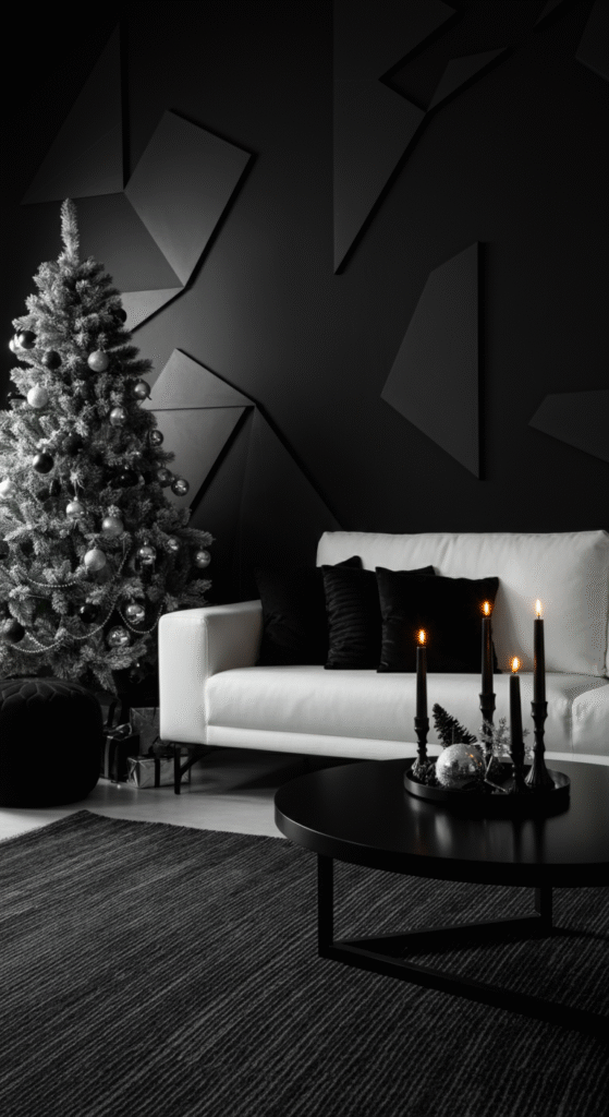 Pair a white sofa with black throw pillows, geometric prints, and matte black candle holders. You can add a metallic touch — silver baubles or chrome reindeer figurines — to reflect twinkle lights subtly.