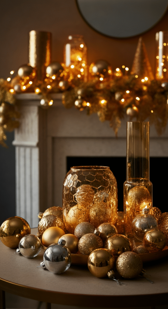 Nothing says “holiday luxury” quite like metallic accents. Whether you prefer gold, silver, bronze, or rose gold, metallics instantly modernize any Christmas setup.