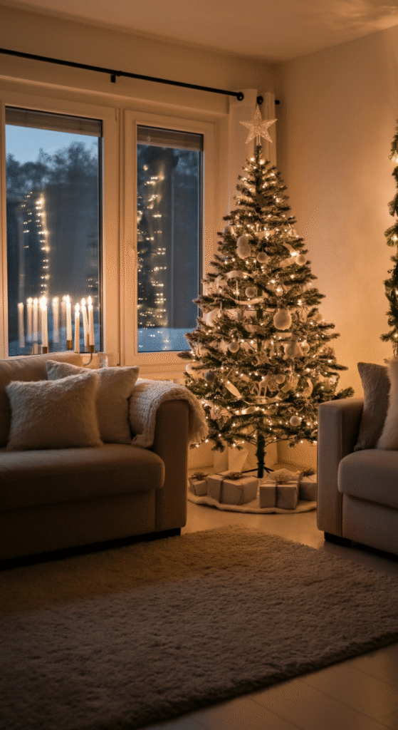 Go for a single, tall tree adorned with matching ornaments, perhaps in white and silver. Replace cluttered garlands with one statement wreath. Add plush textures — faux fur throws, chunky knit blankets, and soft lighting — for that holiday warmth without visual noise.