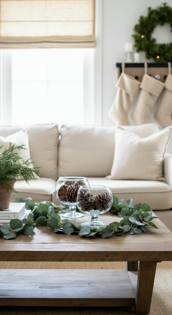 Drape eucalyptus garlands over your mantel, add pinecones in glass bowls, and use linen stockings instead of the traditional red felt ones. The mix of earthy and modern materials creates a serene, grounded space perfect for cozy gatherings.
