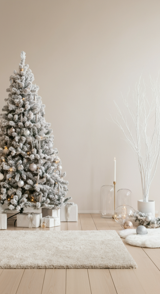 White branches, faux snow, and crystal garlands add a magical sparkle. Keep it cohesive by limiting color pops to metallic or soft pastel accents.