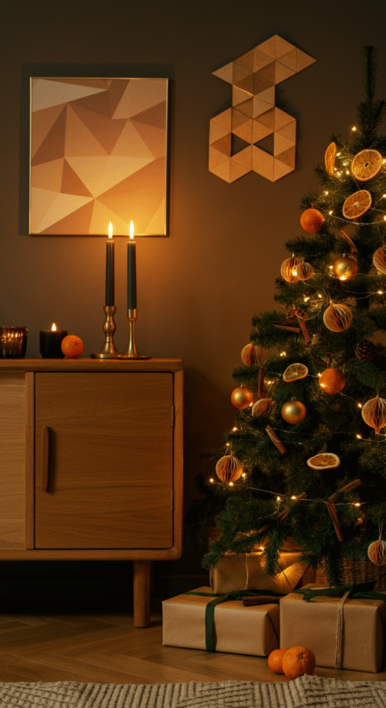 Turn your Christmas living room into a gallery of style. Instead of standard ornaments, use sculptural decor, asymmetrical wreaths, and abstract art pieces.