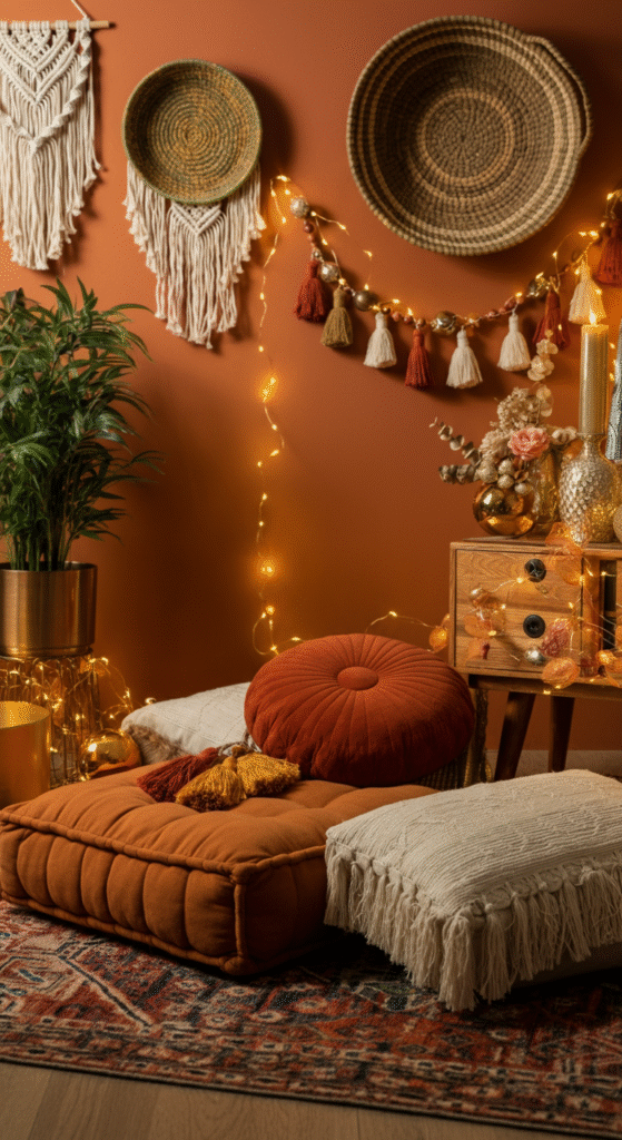 Incorporate warm tones like terracotta, mustard, and olive, paired with natural greenery. Use floor cushions and layered rugs to create a cozy, casual lounge feel.