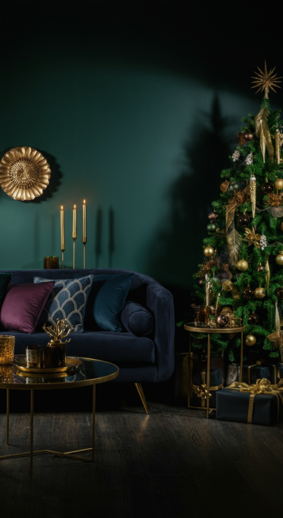 A dark backdrop makes Christmas lights stand out dramatically. Add a velvet sofa, mirrored ornaments, and a few statement candles to complete the look.