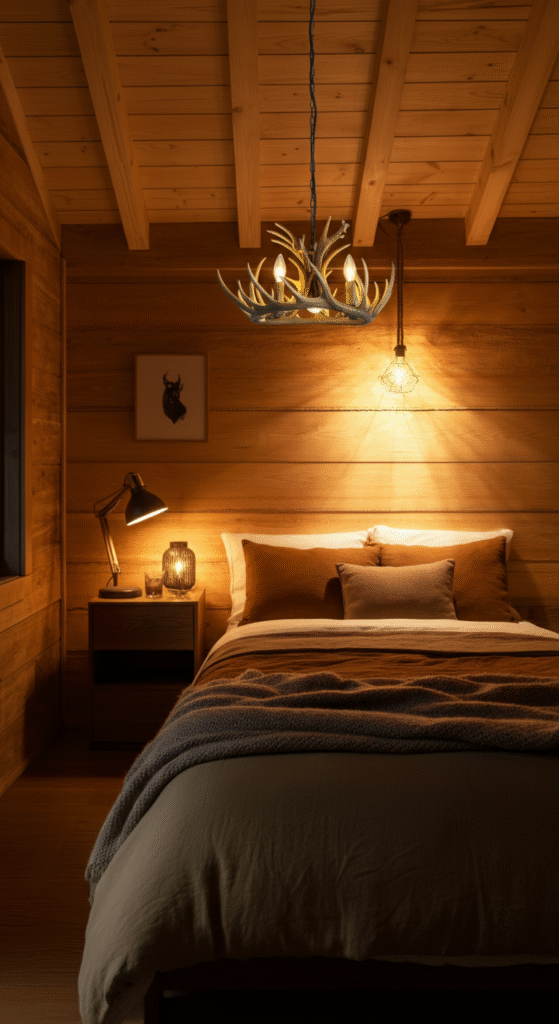 For cabins or farmhouse bedrooms that lean slightly toward country style, antler lights create a bold yet beautiful focal point.