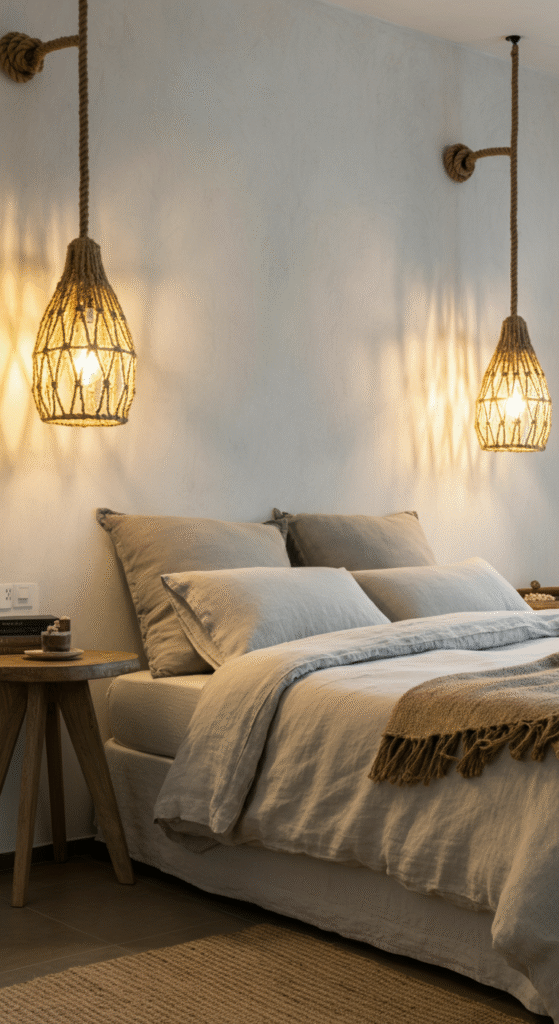 Nothing says rustic charm like natural jute or thick rope. Rope-wrapped lights bring a nautical yet earthy vibe, perfect for a cozy bedroom retreat.