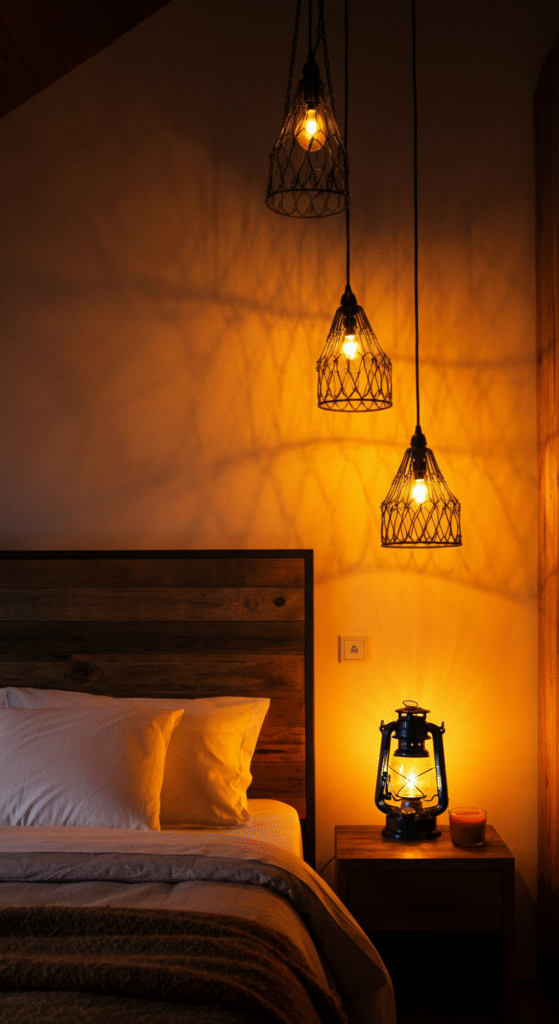 Lighting plays a huge role in creating the ambiance in your bedroom. For a rustic look, go for lighting fixtures that have an industrial feel—think metal pendant lights, wrought iron chandeliers, or lantern-style table lamps. These types of lighting complement the raw, unrefined nature of rustic décor.