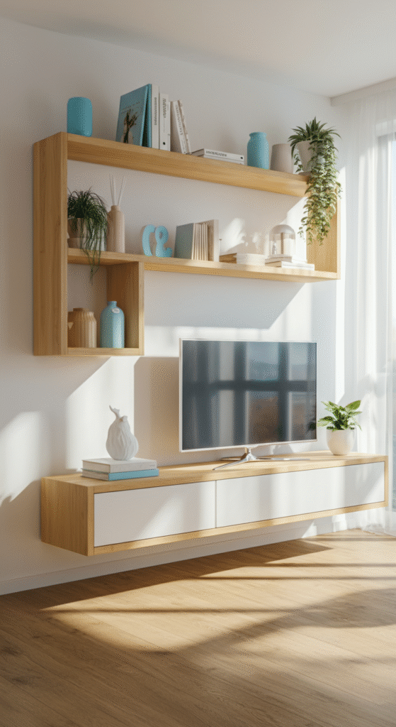 Display beautiful books, ceramics, or plants on shelves that are thoughtfully placed around the room. Floating storage units are also a popular choice, keeping things off the floor and maintaining the clean, minimalist look.