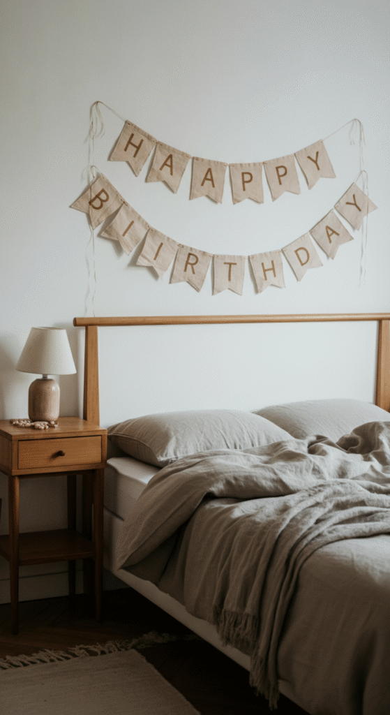 A personalized birthday banner with the celebrant’s name or a simple birthday message adds a personal touch to the room. Keep the design simple and understated, using neutral tones with elegant lettering for that Scandinavian vibe.
