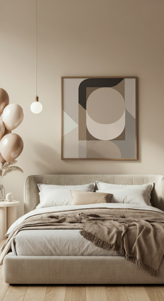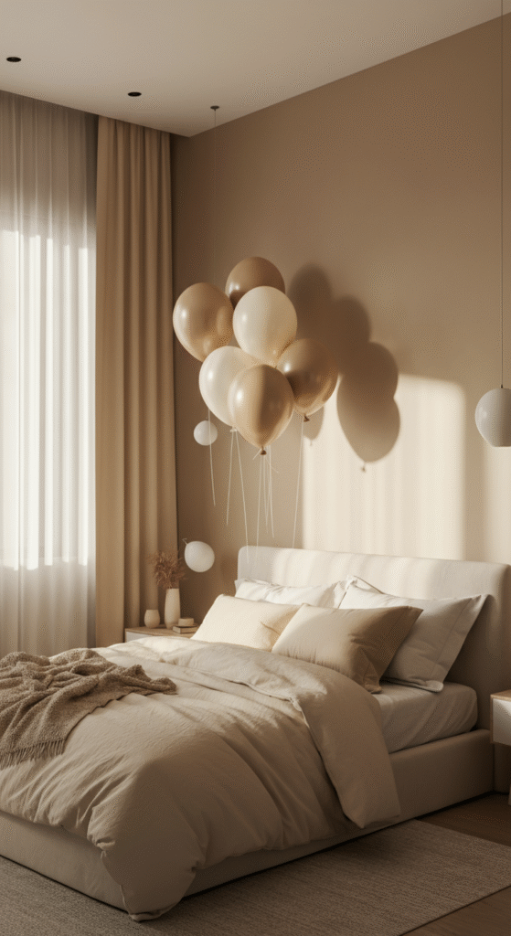 Balloons don’t have to be over-the-top to make an impact. For a Scandinavian bedroom birthday, go for minimalist balloons in natural, earthy tones. Think beige, ivory, and soft gold, rather than the bold, neon colors typically seen in traditional birthday parties.