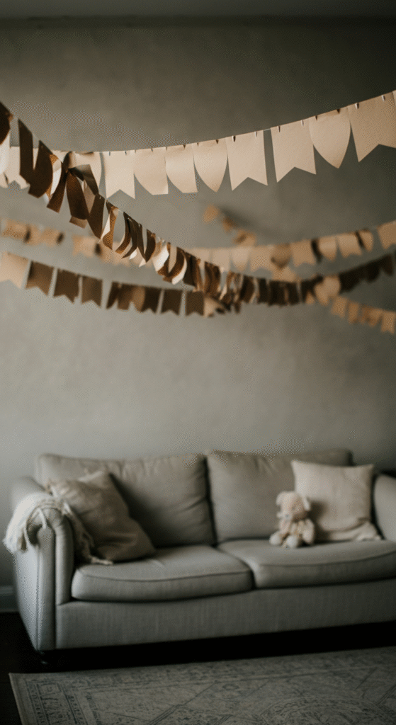 For a handmade touch, consider creating DIY paper garlands with natural materials such as kraft paper or recycled paper. You can hang these garlands across the walls or ceiling for a festive yet minimalist look.