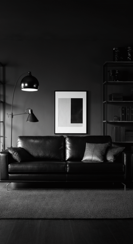 If you love bold statements, the monochrome Scandinavian living room layout might be your perfect fit. This design sticks primarily to black, white, and gray tones, creating a high-contrast, modern, and edgy look.