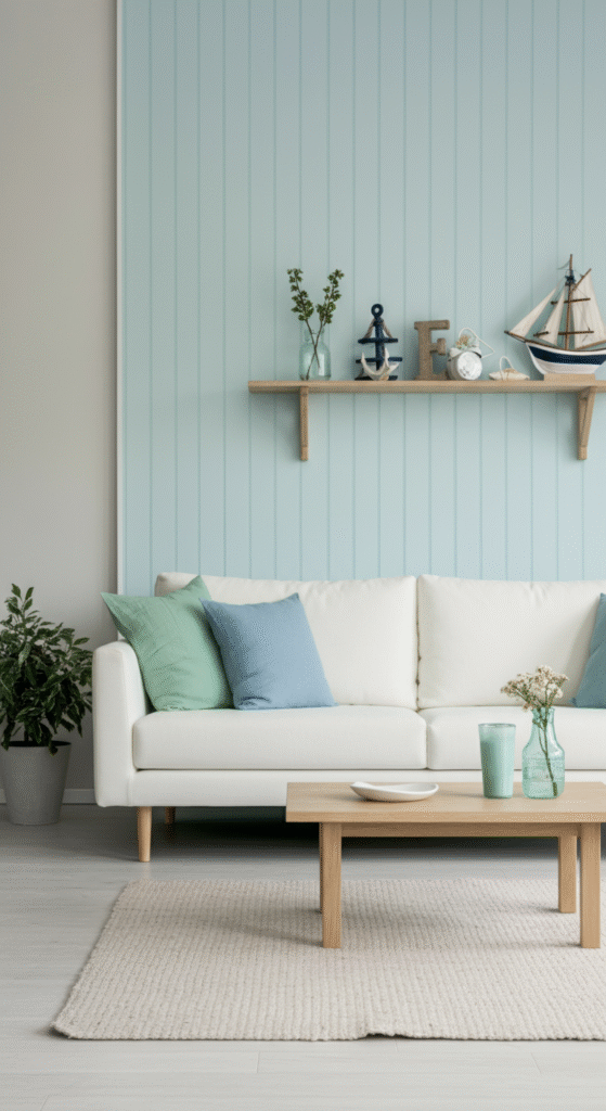 Wooden furniture, paired with woven textiles and natural accents, creates a soothing space that mimics the tranquility of the sea. This layout is perfect for those who want a calm and serene living room that feels connected to nature.