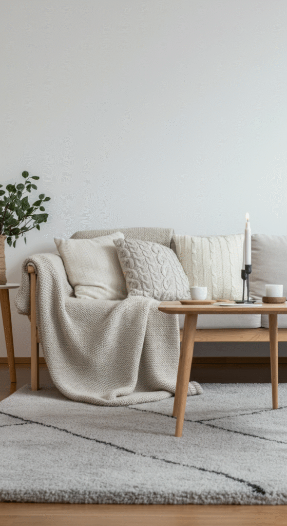 By combining different textures, you can create a cozy, inviting atmosphere that doesn’t feel overstuffed. Whether it’s a chunky knitted throw or a soft woolen rug, tactile comfort is key in Scandinavian interiors.