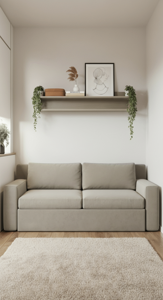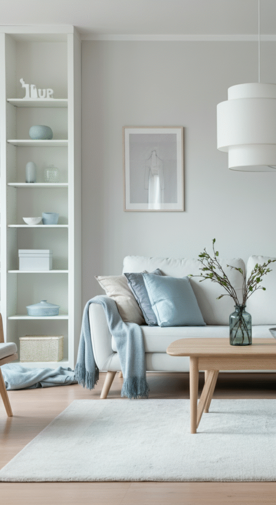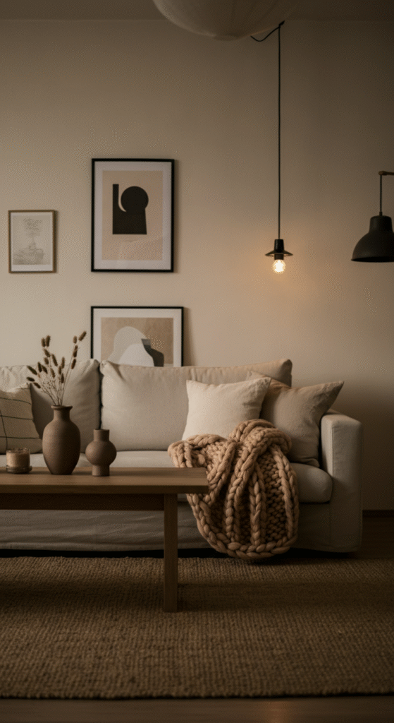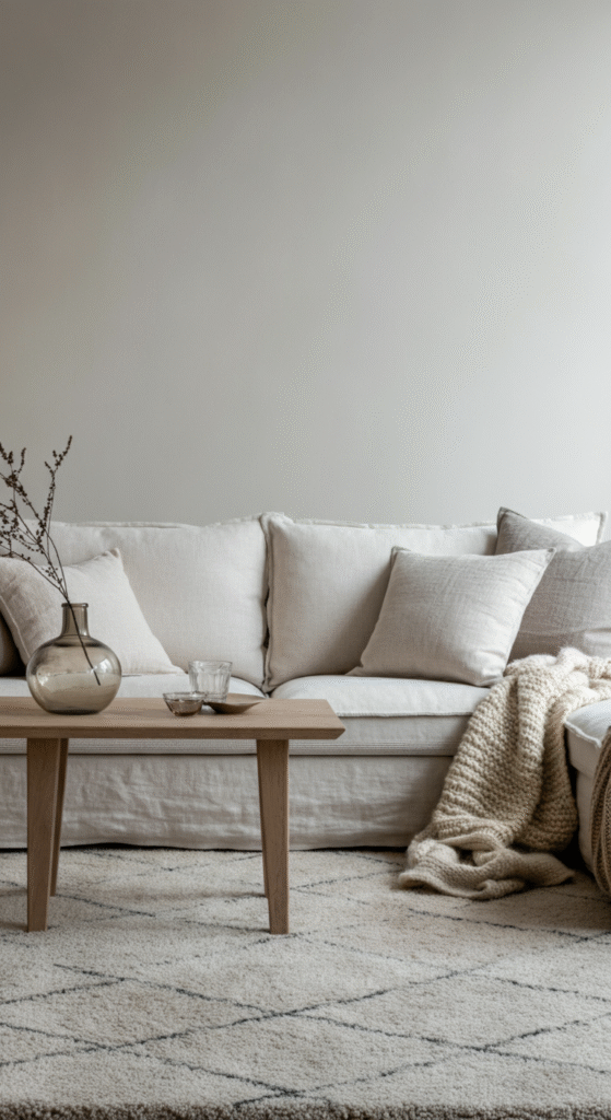 The sofa is often the focal point of the room, with neutral-toned cushions, knitted throws, and a few select pieces of art or decor. Simple yet functional furniture, such as sleek coffee tables or open shelving, creates a clutter-free environment where everything serves a purpose.