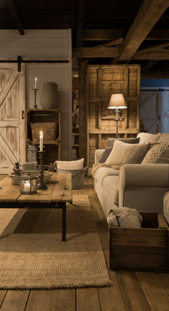 This layout takes inspiration from the charm of farmhouse living and adds a modern Scandinavian twist. The combination of clean, modern lines with rustic elements like barn-style doors, wooden accents, and open shelving creates a cozy, functional living space.