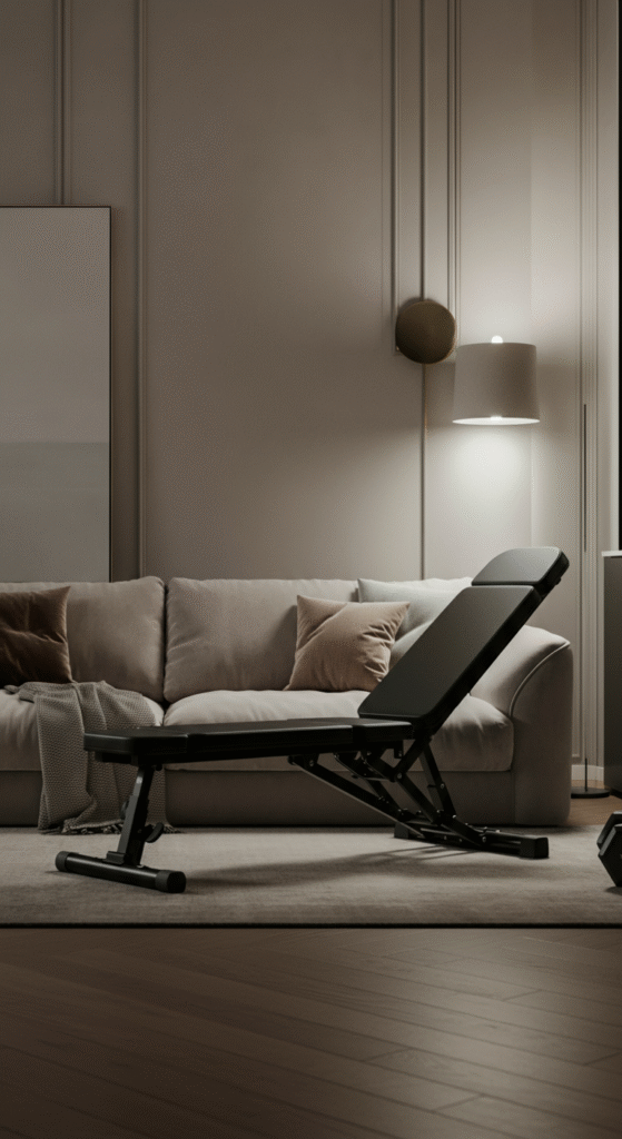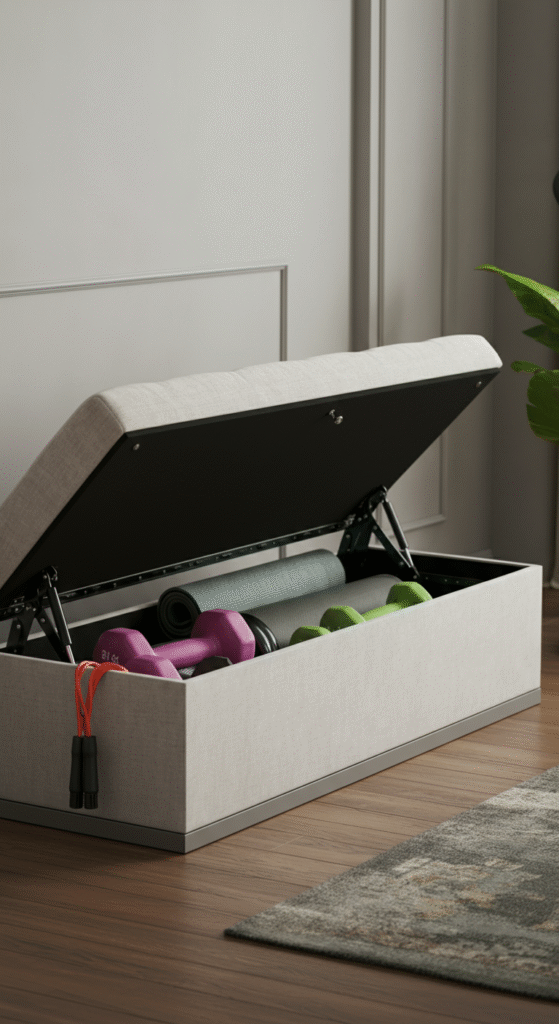 Another clever space-saving solution is a storage bench that can serve both as extra seating and a place to stow your gym equipment. These benches can easily store yoga mats, dumbbells, and small accessories.