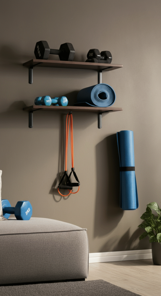 When floor space is limited, look up! Wall-mounted shelves or racks can hold yoga mats, dumbbells, resistance bands, and more. You can even install a vertical climbing wall if you want a bold approach.