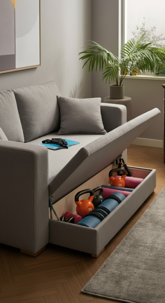 Finding a sofa with built-in storage options can be a game-changer. These sofas allow you to store exercise equipment, blankets, and even some gym mats without taking up additional space.