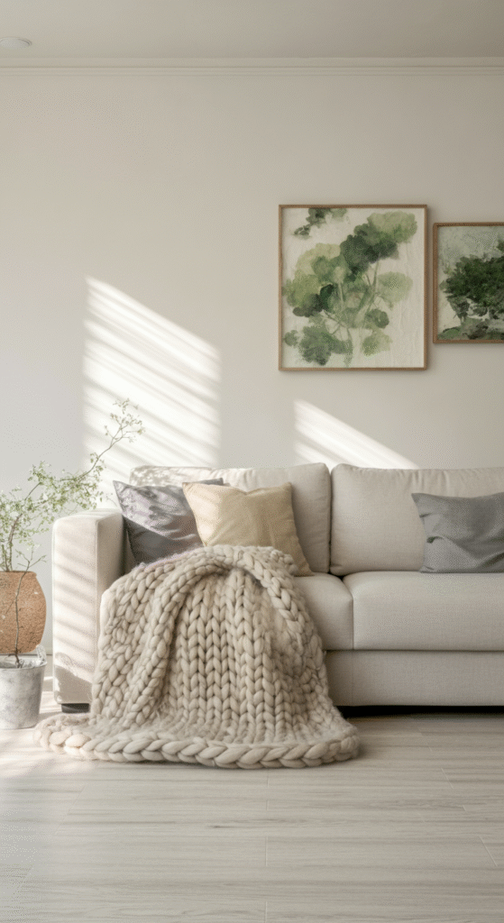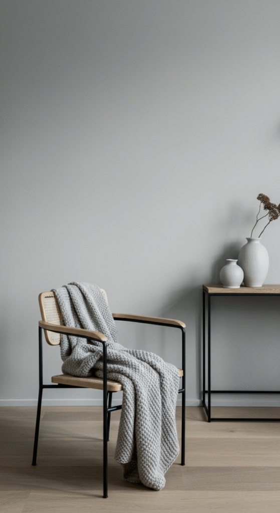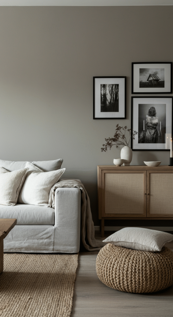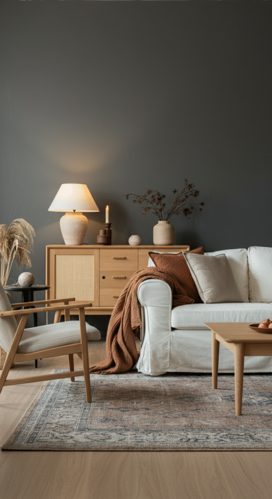 For extra depth, opt for a gray with a hint of blue or taupe. Layering different textures — chunky knits, stoneware vases, soft rugs — ensures the room still feels warm and lived-in.
