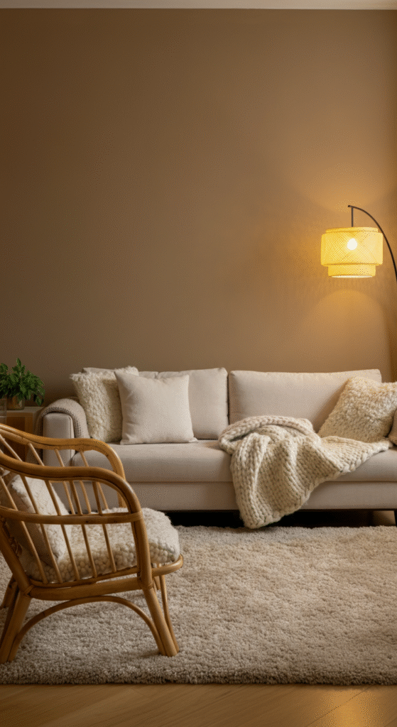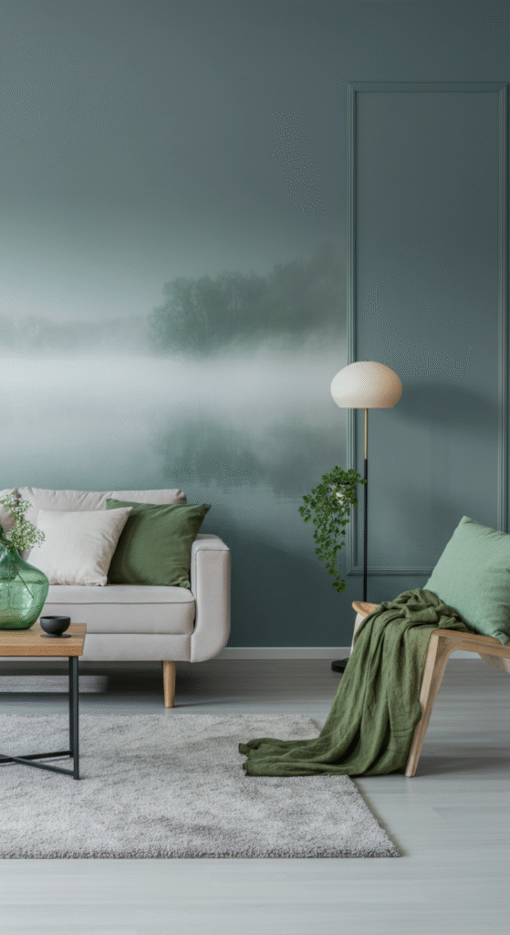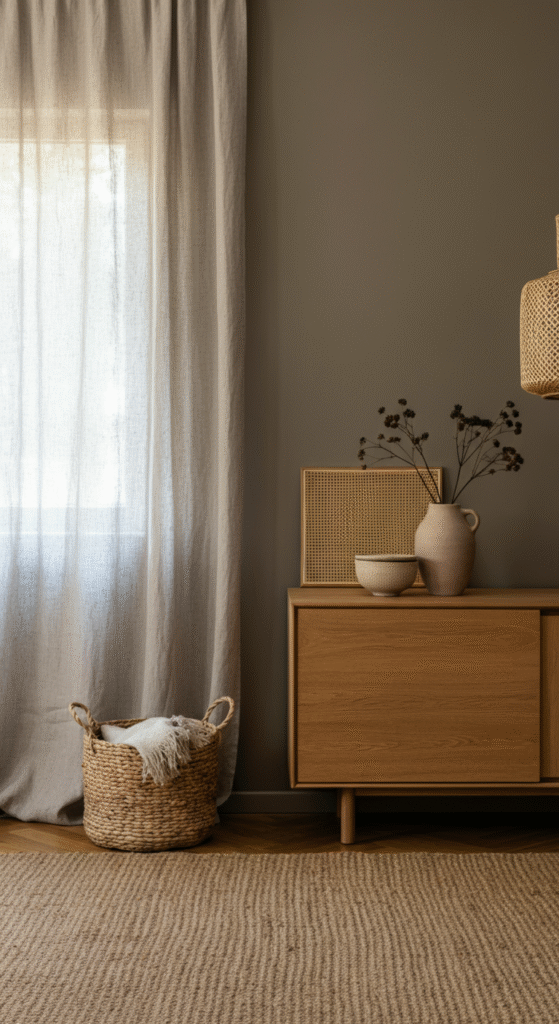This hue works especially well with rattan furniture, wool throws, and linen curtains. The result? A grounded space that feels both modern and natural — like a quiet Scandinavian cabin retreat.