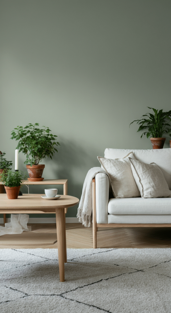 This color pairs seamlessly with light woods, woven baskets, and linen upholstery — ideal for a coastal-inspired Scandinavian living room.
