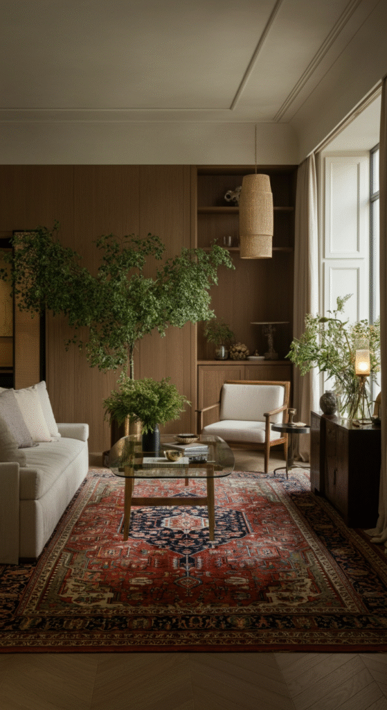 Rugs can define different areas within a living room, such as sitting areas or reading nooks. A high-quality rug—whether it’s a Persian rug, a wool blend, or a minimalist design—can anchor the entire space, providing warmth and texture. Go for neutral or earthy tones for a look that never fades.