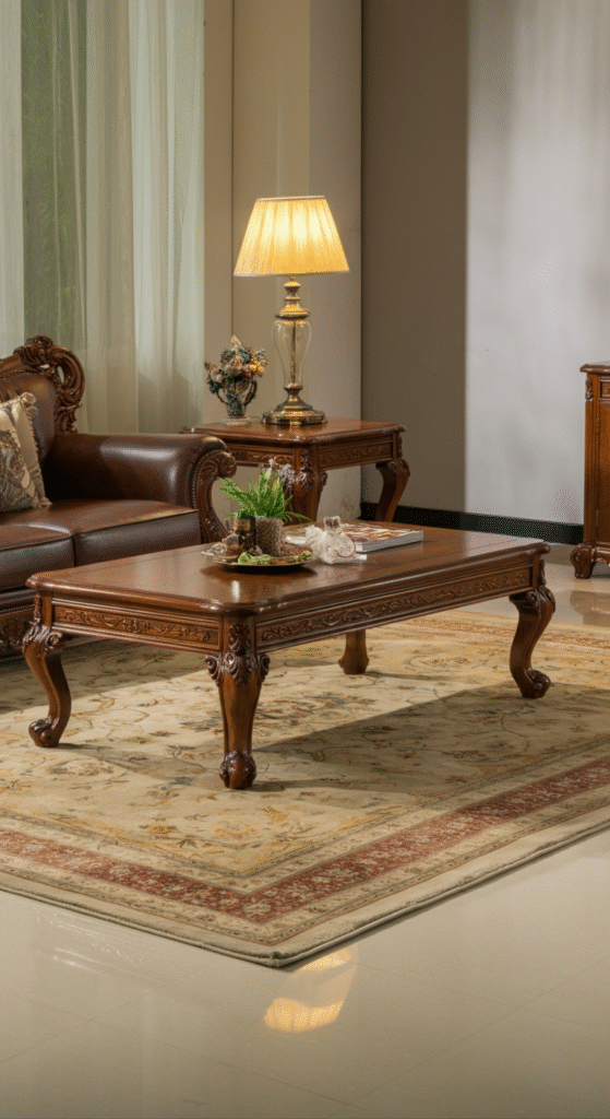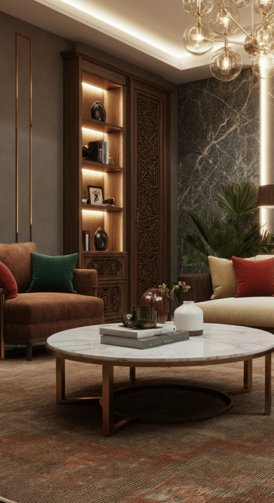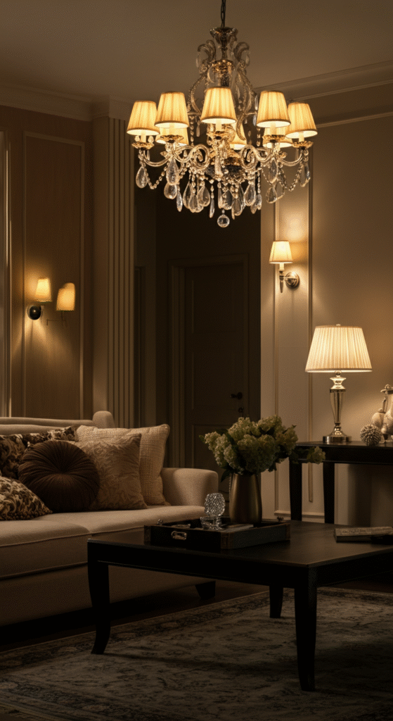 The right lighting can completely transform a living room. Combine ambient, task, and accent lighting to create an inviting atmosphere. Use classic chandeliers, table lamps, or sconces that are both functional and elegant. Layering different types of lighting gives you control over the mood of the space, from bright and energetic to soft and relaxing.