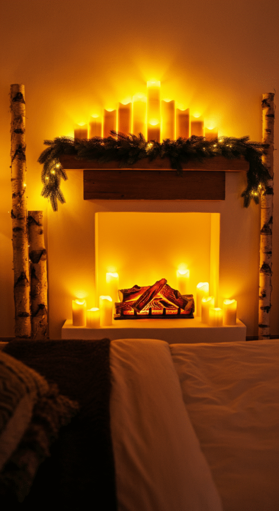 Use LED candles, lanterns, or a digital fireplace display on your TV to simulate the glow and crackle. Add a wood basket filled with birch logs for a realistic touch.