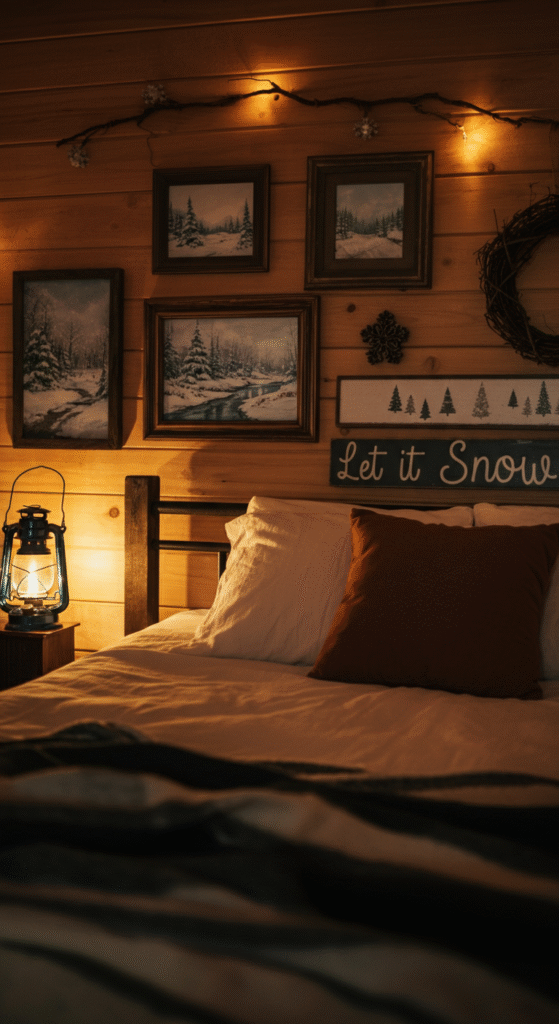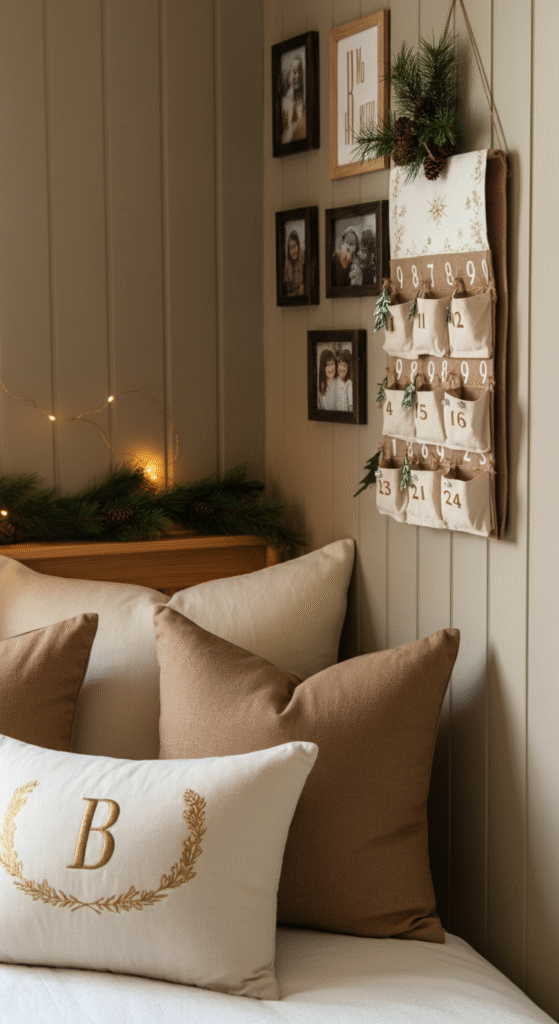 Monogrammed pillows, a photo collage with rustic frames, or even a DIY advent calendar above your bed can add a personal, festive flair. Display family heirlooms, travel souvenirs, or handmade ornaments to make the room feel lived-in and meaningful.