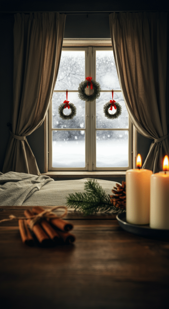 Add a small wreath or star ornament to each window for a festive finishing touch—it frames the winter view beautifully from both inside and outside.