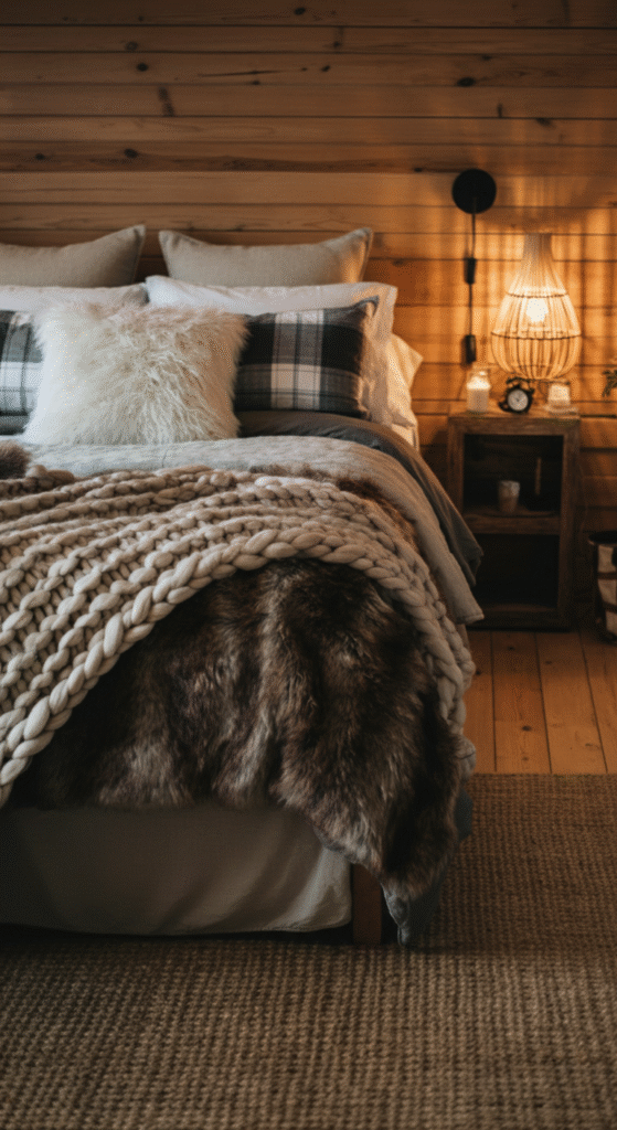 Cabin charm thrives on texture. Smooth walls and plain bedding alone won’t create that warm, lived-in feel.