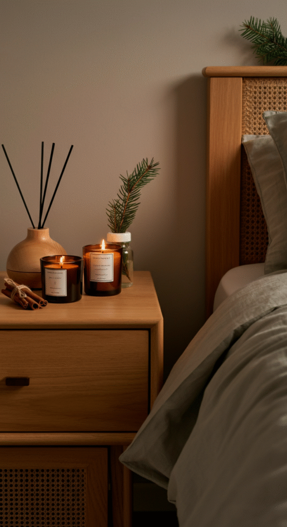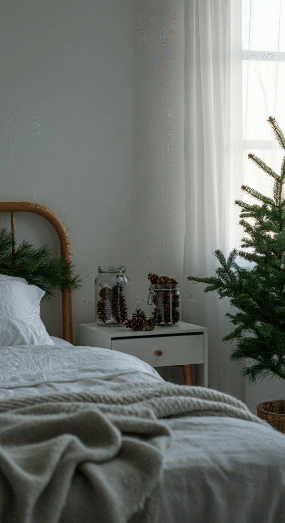 Bring in fresh pine branches, eucalyptus, cedar garlands, or even a small Christmas tree beside your bed. You can also fill glass jars with pinecones, dried oranges, or cinnamon sticks for natural fragrance and rustic style.