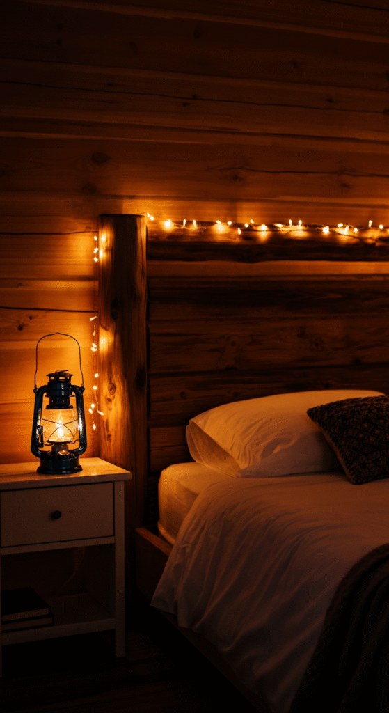 Swap harsh white bulbs for warm-toned or amber ones. Add string lights along your headboard, bedside tables, or windows to create that soft glow reminiscent of candlelight. Lantern-style lamps or mason jar lights also enhance the rustic charm.