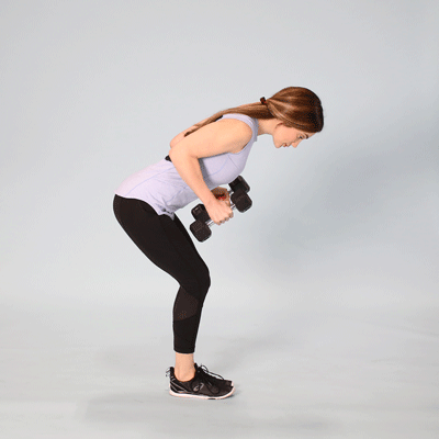 - Hinge at the hips with a dumbbell in each hand, elbows tucked in.