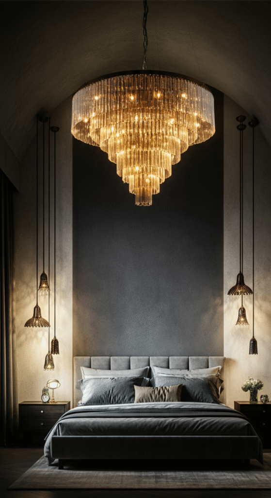 Lighting isn’t just for functionality; it can also be a statement piece in an eclectic bedroom. Choose chandeliers, pendant lights, or unique floor lamps that stand out and draw attention. Go for a bold, oversized light fixture or something with intricate details that will become the room’s focal point.