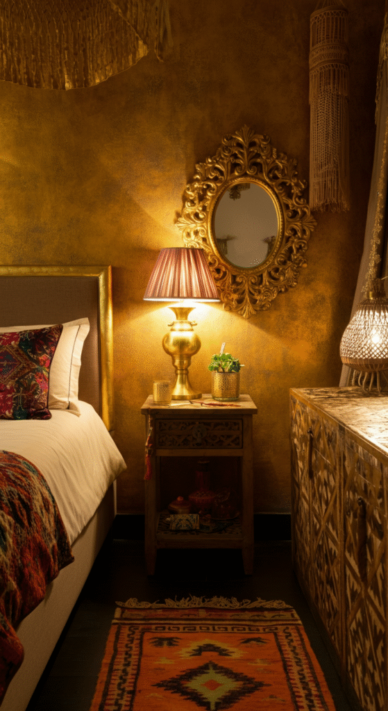 While wood and textiles dominate eclectic bedrooms, metallic elements can add an element of glamour and luxury. Think gold-framed mirrors, copper lamps, or brass drawer pulls. These metallic accents work beautifully with both neutral and bold tones.