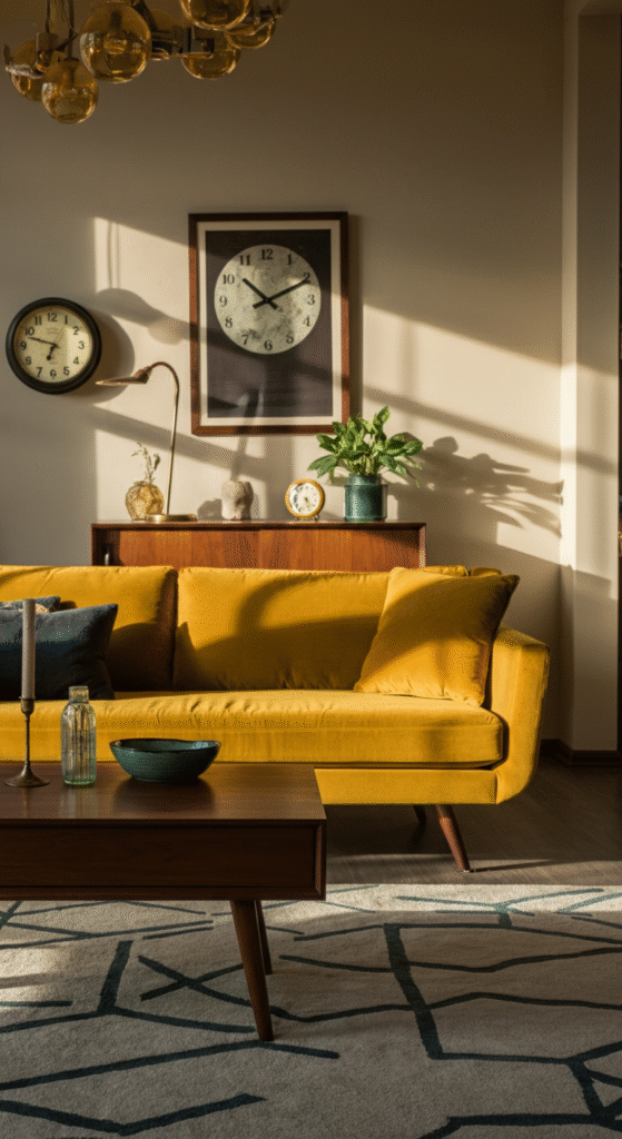 A deep mustard-yellow sofa paired with clean, mid-century furniture sets the tone for a retro-chic living room. Think walnut wood legs, tapered arms, and geometric side tables. The rich hue of mustard provides warmth and grounding—especially when accessorised with creams and dark woods.