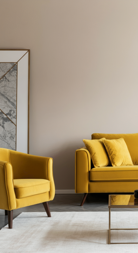 An alternative approach: keep the overall furniture minimal—neutral sofa, clean lines—but introduce mustard cushions, throws, even a rug. The colour then becomes a subtle punch of character.