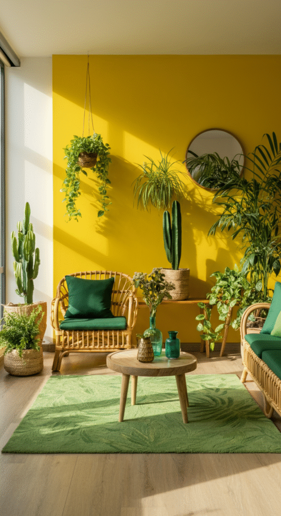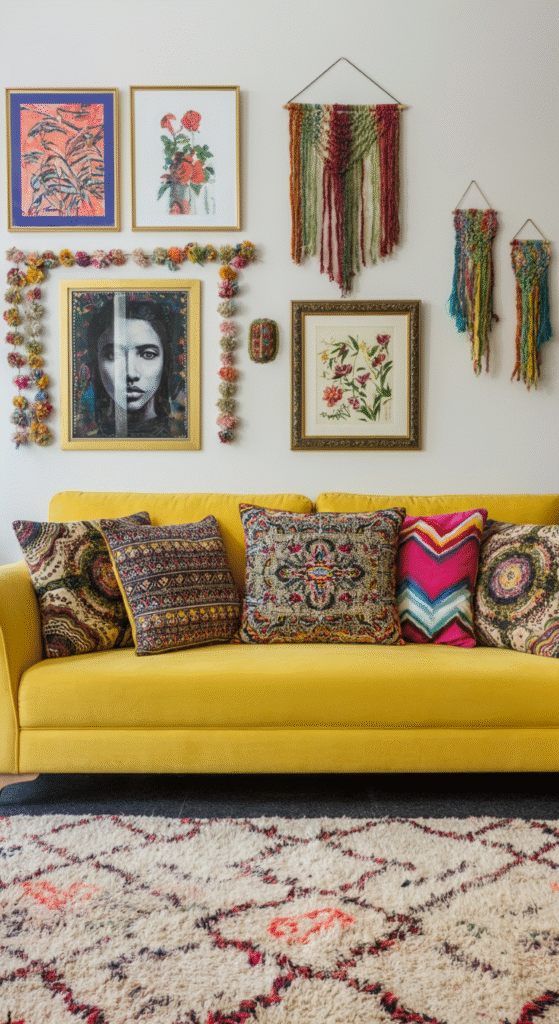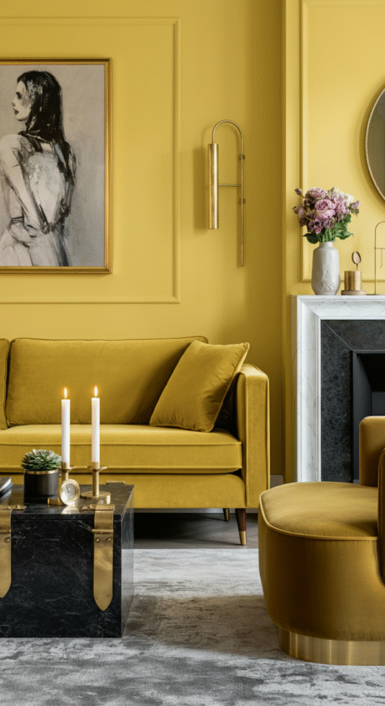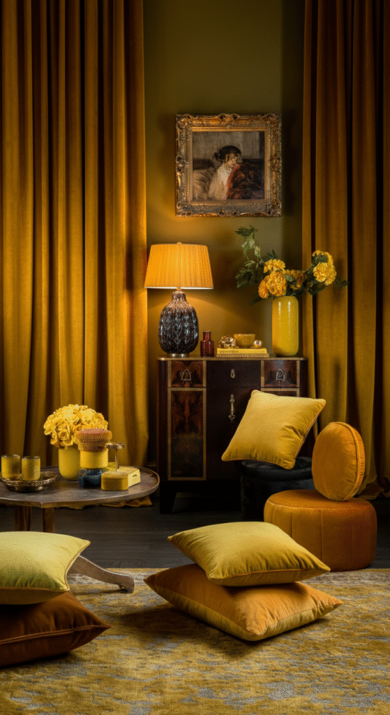 Yellow doesn’t have to be flat. Use textiles and finishes: mustard velvet cushions, butter-yellow wool rug, ochre curtains, gold-leaf frames. Texture gives depth and richness, especially in eclectic interiors.