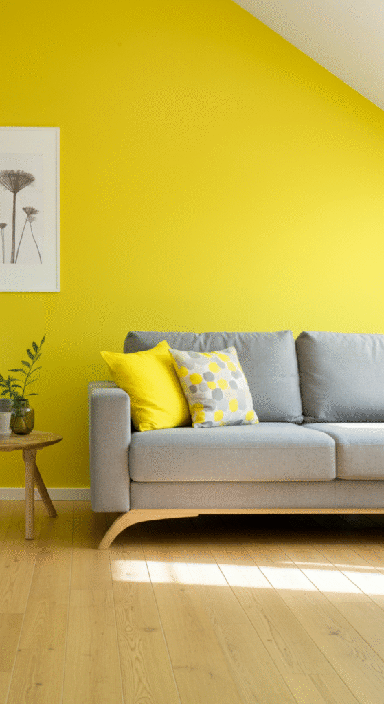 If you’re unsure about fully committing to yellow, one smart move is painting a single accent wall in a vibrant lemon-yellow while keeping other walls neutral (soft white or warm grey). This allows the yellow to pop without overwhelming the room.