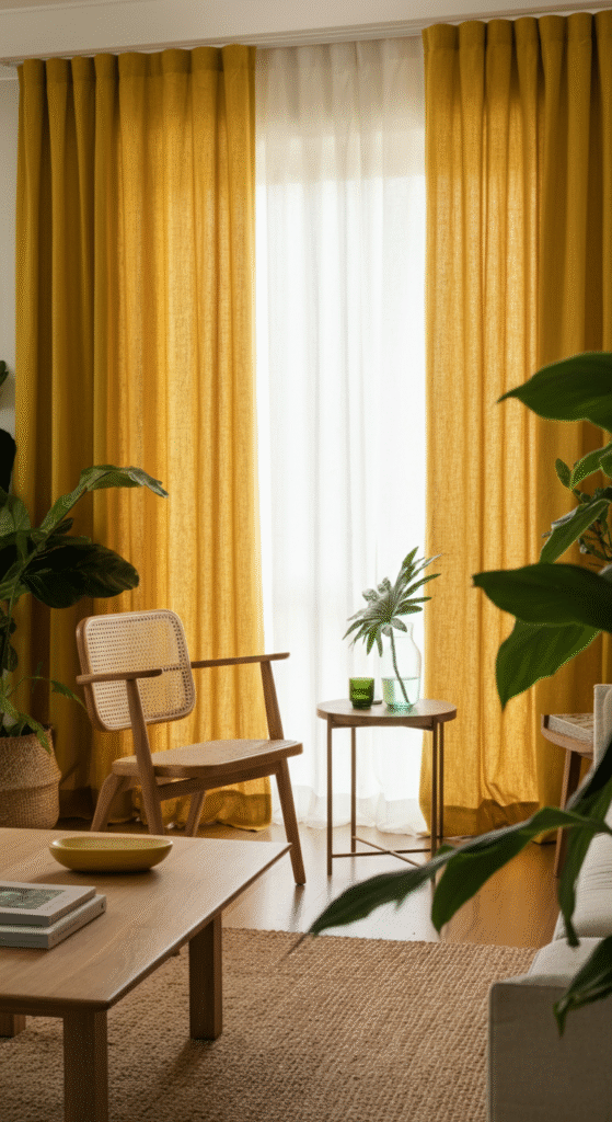 Wall colour stays neutral—but the curtains are mustard yellow. Combine this with natural wood furniture (teak or oak) and perhaps rattan or cane accents for a relaxed yet rich look.