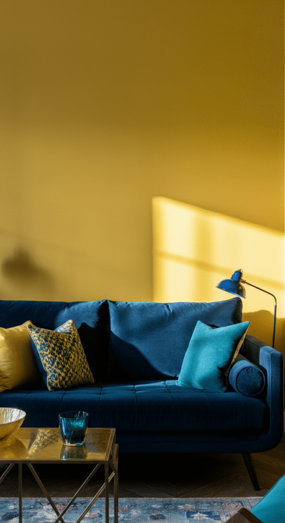 Yellow and blue have long been complementary pairing in interiors. Use a golden-yellow wall or sofa and pair it with deep navy or sky-blue accents (pillows, vases, side-chairs) for a dynamic look.