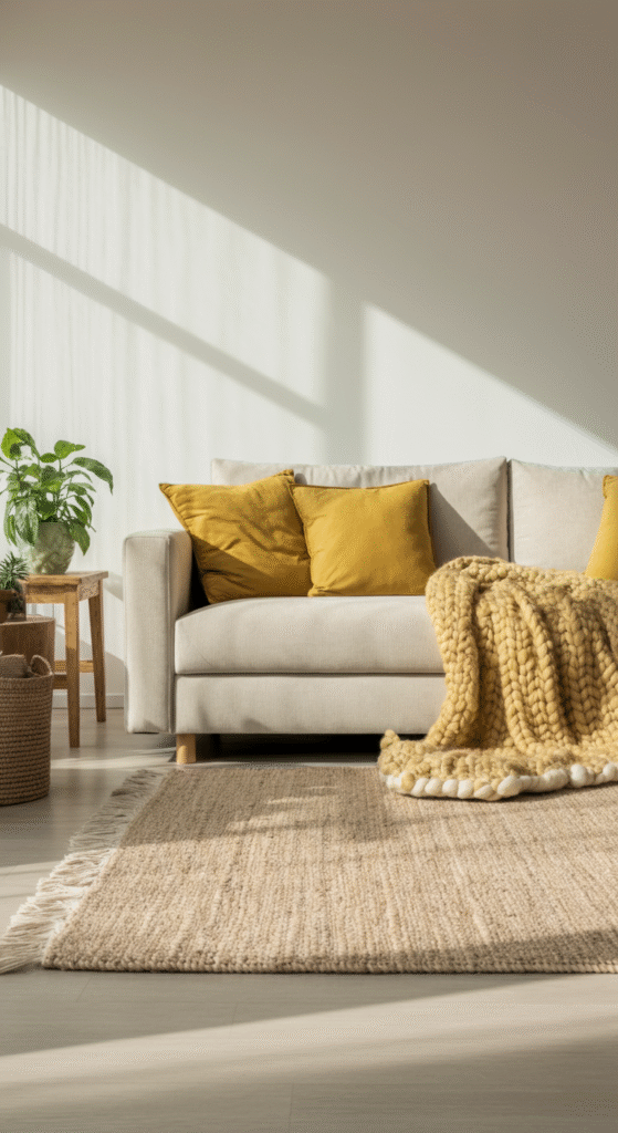 • Add a plush rug in a complementary tone (olive green or charcoal) to balance.