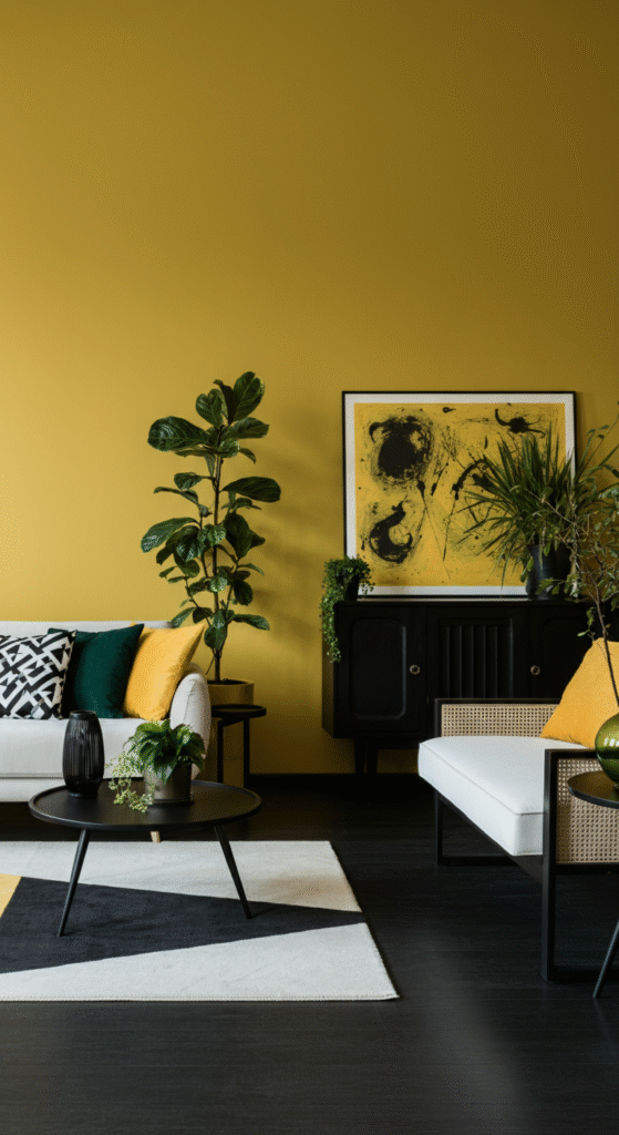 For the daring: paint most walls in a saturated yellow (sunny or golden) and then offset with black, white, or charcoal elements—picture black framed artwork, white sofas, graphic rugs.