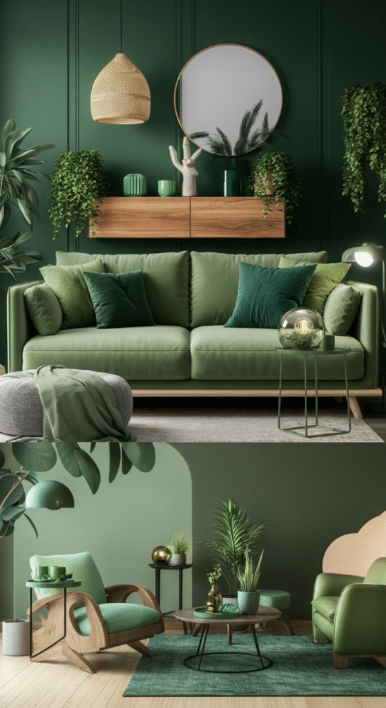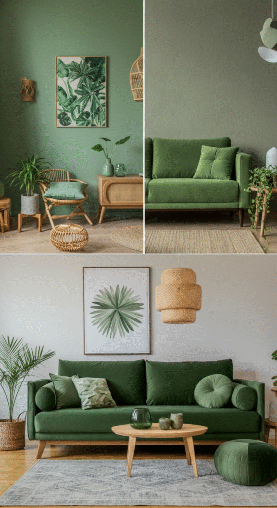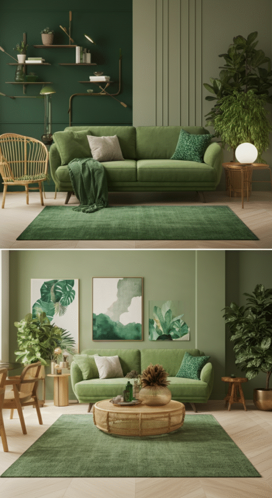 Green works well with a variety of furniture styles. When choosing furniture for your green living room, consider materials and colors that complement the green tones.