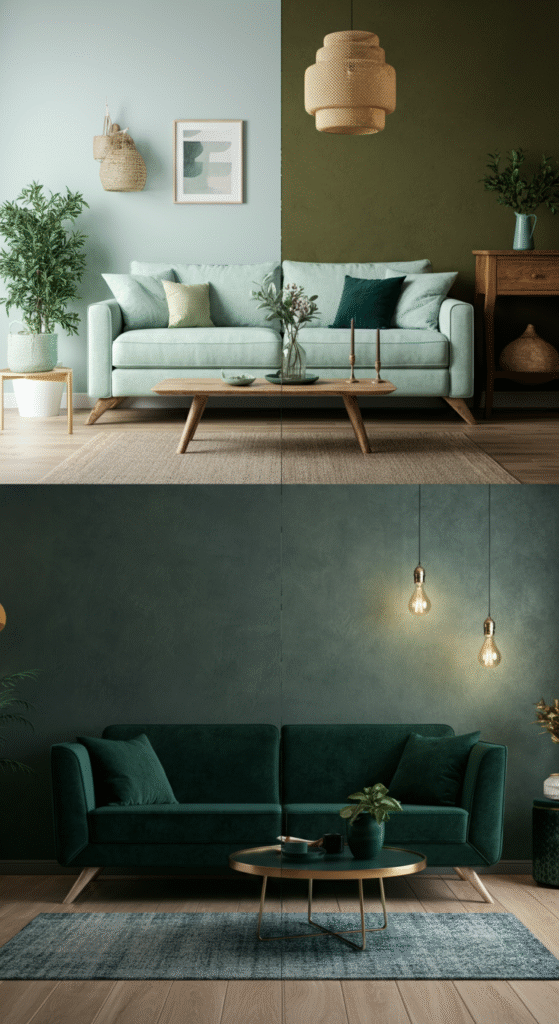 - Low-Light Spaces: For rooms that don’t receive much sunlight, go for lighter greens like mint or sage. These colors will help reflect any available light and make the room feel more open and airy.