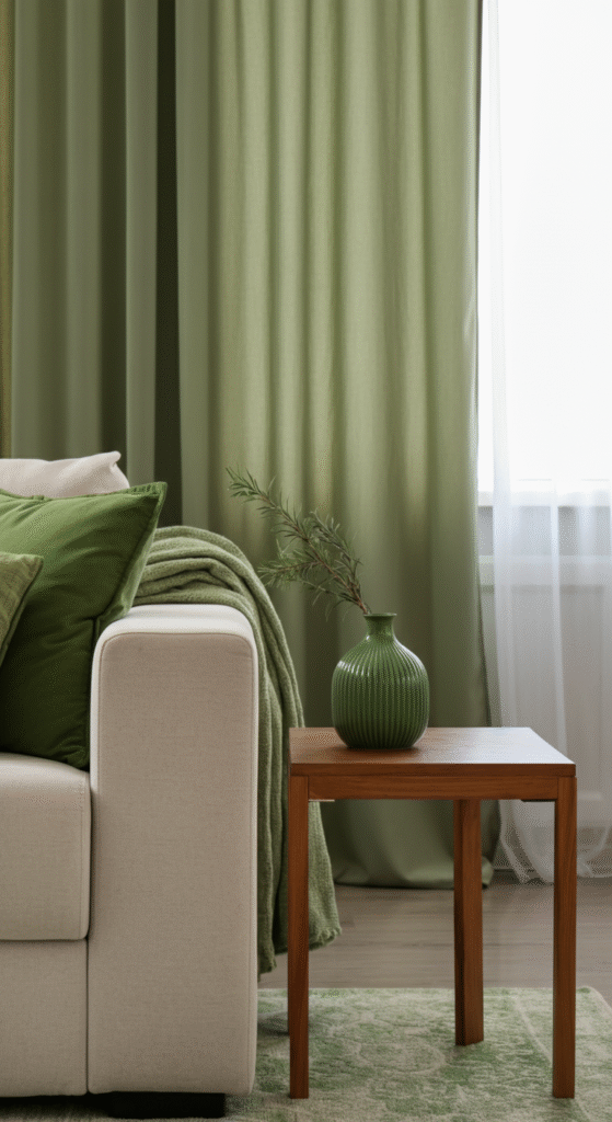 - Green Curtains or Drapes: Adding green curtains or drapes is a subtle but stylish way to incorporate green without overhauling your entire living room decor. Choose a light, translucent green fabric for a soft, ethereal look, or go for a deeper green for a more dramatic effect.